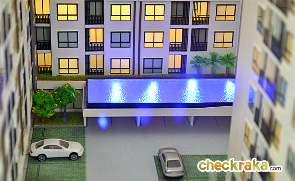 โมเดลจำลองตำแหน่งสระว่ายน้ำแบบ Infinity Edge ขนาด 19 x 5.4 เมตรที่ตั้งอยู่ที่ชั้น 2 บริเวณฝั่งขวาของอาคาร 2