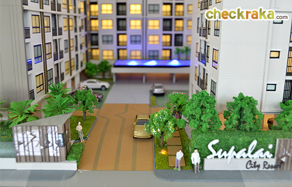 จากโมเดลจำลองจะมองเห็นป้อม รปภ. ตั้งอยู่ด้านซ้ายของประตูเข้า-ออกโครงการ