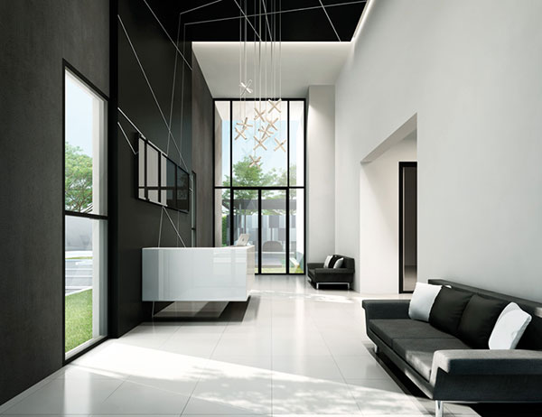 Lobby แบบ Double Volume สูงโปร่ง ที่สร้างไว้ด้านหน้าของอาคาร ตั้งอยู่บริเวณชั้น 1 ของอาคารพักอาศัย