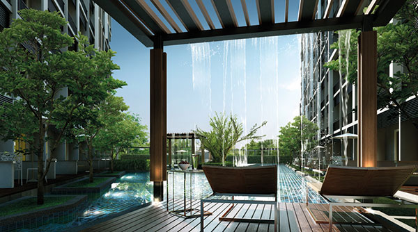 ภาพจำลองบรรยากาศม่านน้ำตกและบริเวณที่นั่งเล่นตรงสระว่ายน้ำที่อยู่ตรงกลางระหว่างอาคาร A และอาคาร B