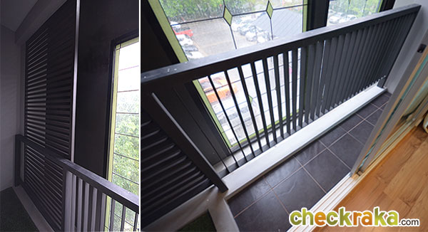 ระเบียงทรงยาวขนาดพื้นที่ไม่กว้างมาก ด้านซ้ายของระเบียงทำระแนงแนวตั้งสูงถึงเพดานไว้บังคอมแอร์