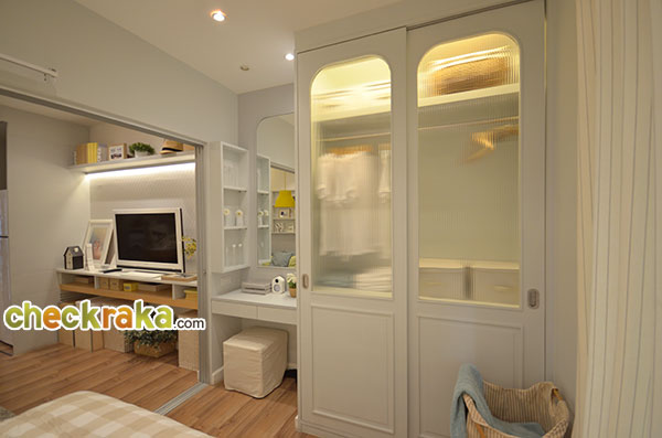 ตู้เสื้อผ้าและโต๊ะเครื่องแป้งสีขาวเข้าชุดมาให้ แต่ห้องที่ขายจริงจะได้ตัววัสดุเฟอร์นิเจอร์และแบบไม่เหมือนกันกับห้องตัวอย่างนะคะ (สามารถขอชมตัวอย่างวัสดุเฟอร์นิเจอร์บิ้วท์อินที่ทางโครงการจัดให้ที่ Sales Gallery ได้ค่ะ)