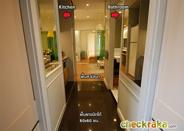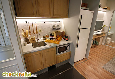 เปิดประตูเข้ามาภายในห้อง พื้นที่ส่วนแรกซ้ายมือเป็น Build in Pantry ครัว พร้อมตู้ลอยติดผนัง