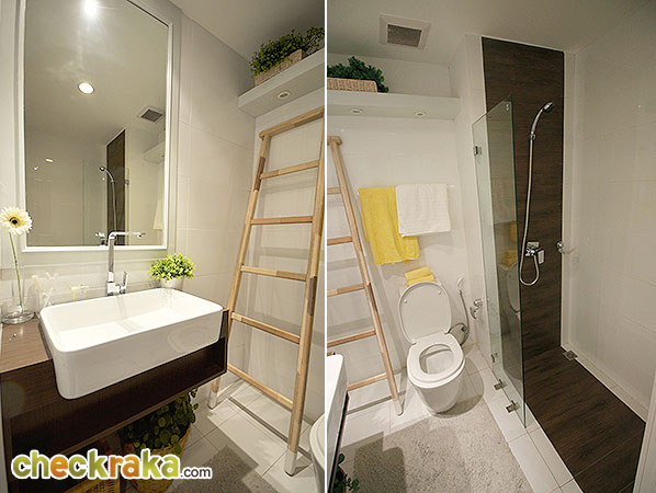 ตัดลายด้วยกระเบื้องลายไม้สีเข้มที่บริเวณพื้นที่ฝั่งเปียก (น่าเสียดายทางโครงการน่าจะจัดฉากกั้นอาบน้ำบานเต็มมาให้