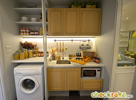 ส่วนฝั่งครัวทางโครงการจะบิ้วท์อิน Pantry และตู้ลอยมาให้ รูปร่างลักษณะเดียวกันกับห้องตัวอย่างนี้