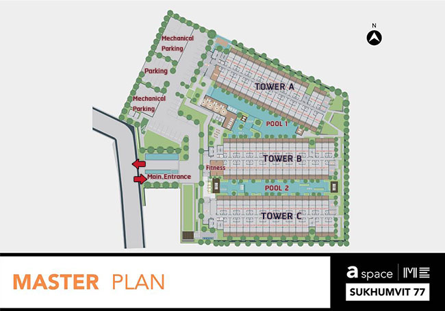 "a space ME สุขุมวิท 77" เป็นโครงการคอนโด Low Rise ขนาดความสูง 8 ชั้น จำนวน 3 อาคาร ทุกอาคารมีลิฟต์ 2 ตัว โดยอาคาร A มี 277 ยูนิต, อาคาร B มี 277 ยูนิต และอาคาร C มี 278 ยูนิต จำนวนยูนิตรวม 832 ยูนิต (คิดเป็นสัดส่วนการใช้งานลิฟต์ต่ออาคารอยู่ที่ 139 : 1 อัตราไม่ได้มากจนเกินไป) แปลงที่ดินโครงการมีขนาด 7-0-11.3 ไร่ มีพื้นที่จอดรถประมาณ 40% โดยที่จอดรถของโครงการมีทั้งส่วนที่เป็นลานจอดรถกลางแจ้งและส่วนของที่จอดรถอัตโนมัติ "Mechanical Parking" ที่ช่วยประหยัดเวลาในการวนหาที่จอดรถ เพียงขับรถเข้าไปรอในช่องจอดที่ว่าง (มี 10 ช่องจอด รวมที่จอด 246 คัน) เพียงเท่านี้ตัวรถยนต์ก็จะถูกยกขึ้นไปจัดเก็บบนช่องจอดโดยอัตโนมัติ (ใช้เวลาไม่เกิน 2 นาทีต่อ 1 คัน) ส่วนเรื่องส่วนกลางที่นี่มีสระว่ายน้ำอารมณ์รีสอร์ตที่จัดวางระหว่างกลางของตัวอาคารให้ 2 จุด (ขนาดสระ กว้าง 8 x 50 เมตร) นอกจากนี้ก็ยังมีห้องออกกำลังกายพร้อมอุปกรณ์ขนาดพื้นที่ 70 ตร.ม. ตั้งอยู่ที่บริเวณชั้น 1 ของอาคาร B
