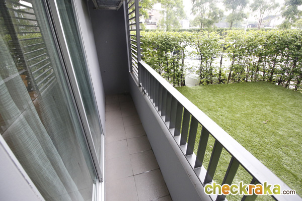 ระเบียงเป็นแนวยาวพื้นปูกระเบื้อง มุมด้านในมีพื้นที่วางคอมเพรสเซอร์แอร์