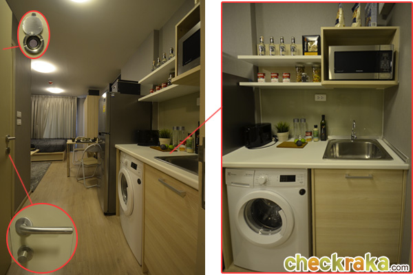 ประตูทางเข้ามีดับเบิลล็อค ประตูแบบมือจับ และช่องตาแมว เข้าไปด้านหน้าก็จะเป็นส่วน Pantry
