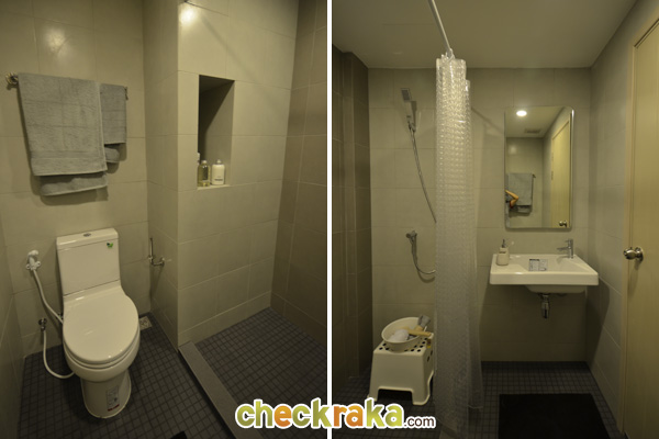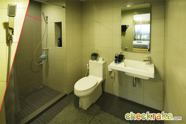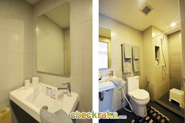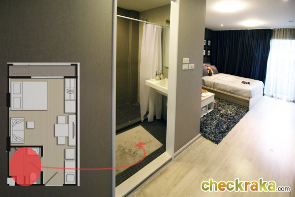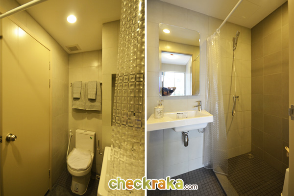 เข้ามาดูห้องน้ำของห้องขนาด 26 ตร.ม.นี้ มีกั้นส่วนแห้งส่วนเปียกให้ แต่ Layout จะแตกต่างกันนิดหน่อยค่ะ