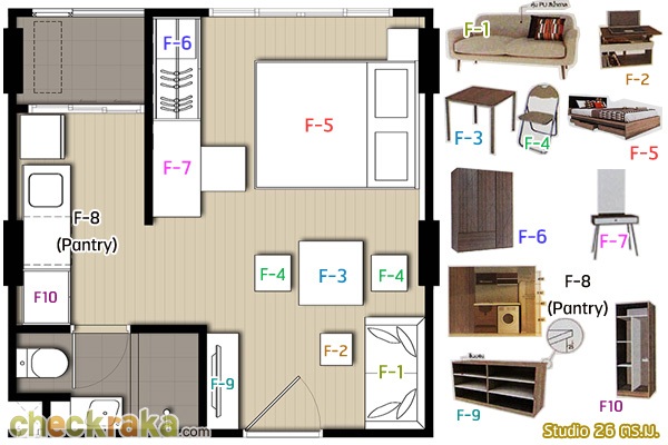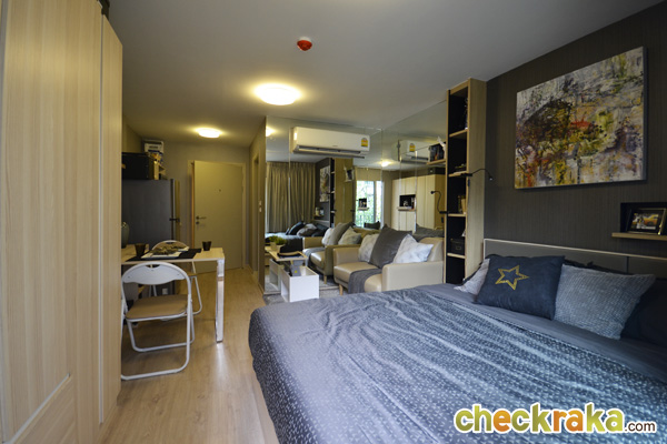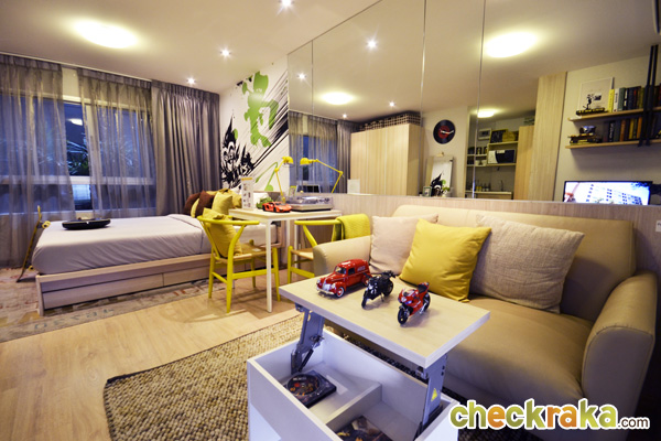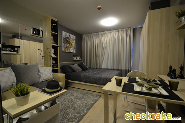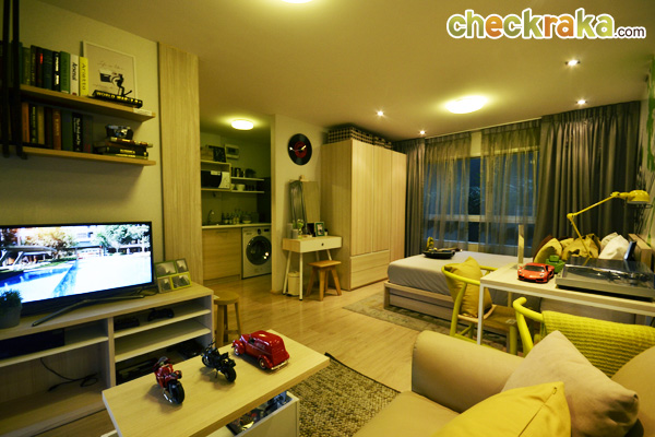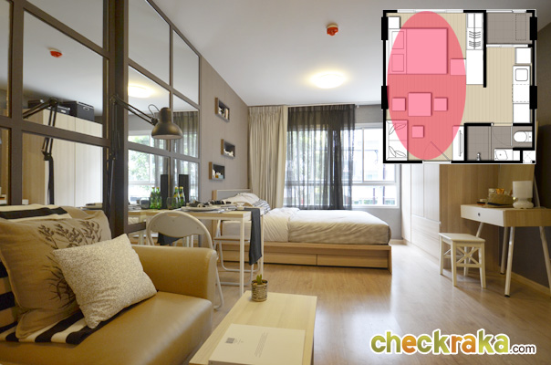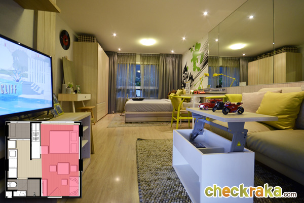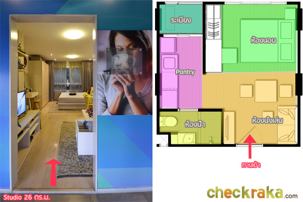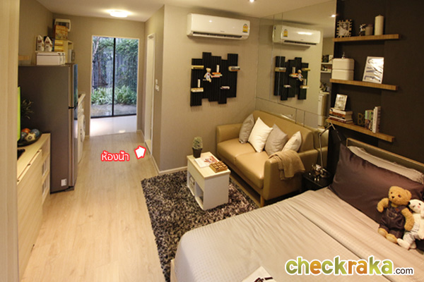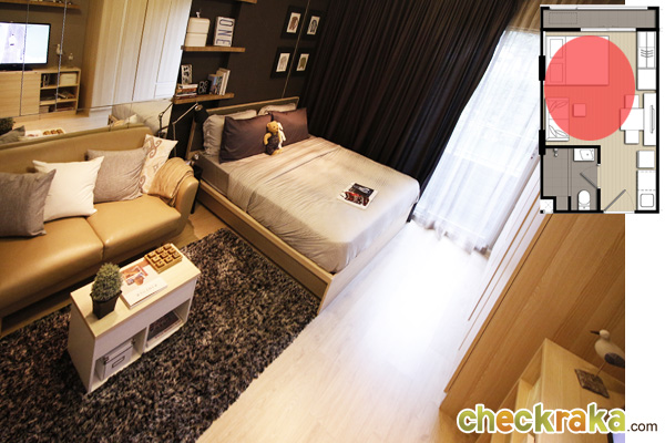 ต่อไปมาดูห้อง Studio อีกห้องนึง ซึ่งมีขนาดกว้างขึ้นที่ 26 ตร.ม. โดยห้องนี้จะมีสัดส่วนของห้องนั่งเล่นและห้องนอนที่กว้างขึ้น และมีการแยกส่วน Pantry ไว้ชัดเจนกว่าห้องแบบ 24 ตร.ม. และในส่วนของเฟอร์นิเจอร์ที่ได้ ก็มีให้ครบพร้อมเหมือนกันค่ะ