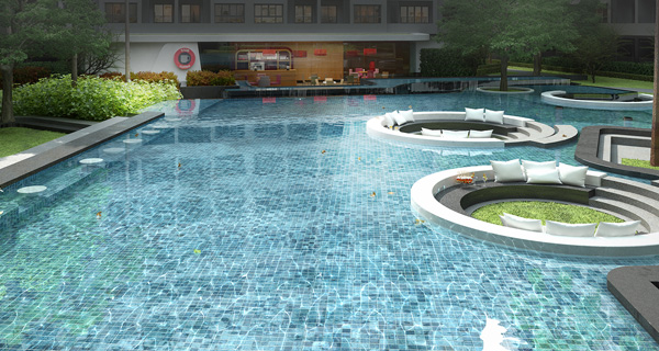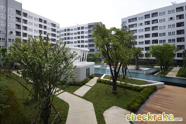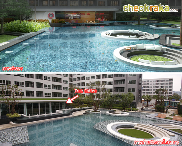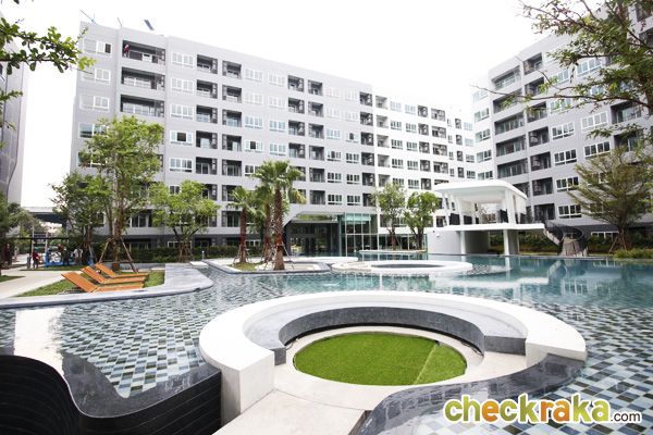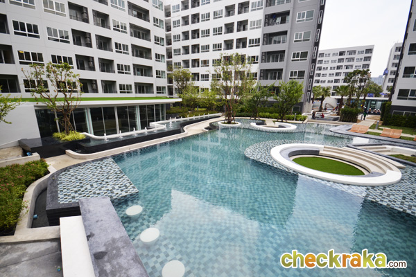 - ส่วนกลางและตัวโครงการ - สำหรับส่วนที่เรียกว่าเป็นจุดเด่นและจุดขายของโครงการเลยก็คงจะเป็นในเรื่องของส่วนกลางและสิ่งอำนวยความสะดวก โดยโครงการมีสวนส่วนกลางเกือบ 5 ไร่ มีพร้อมทั้งสระว่ายน้ำขนาดใหญ่ถึง 2 สระแบ่งเป็น 3 Concept คือ Island, Water Fall, และ Cliff สระว่ายน้ำส่วนแรกมีความยาวถึง 85 เมตร แบ่งเป็น 2 ส่วน โดยมีอาคาร H คั่นกลางโดยทำตัวสระลอดใต้อาคาร มีจุดพักผ่อนหย่อนใจอยู่รายล้อมรอบสระ ทั้งที่นั่งในสระและริมสระ สระว่ายน้ำส่วนที่ 2 ขนาดเล็กกว่า มีทั้งสระว่ายน้ำธรรมดาและแบบสระน้ำล้น เพิ่มความเป็นสไตล์รีสอร์ท และมีอาคารฟิตเนสอยู่ในส่วนสระว่ายน้ำส่วนที่ 2 นี้ นอกจากนี้ ยังรายล้อมไปด้วยสวนสีเขียว ต้นไม้ใหญ่มากมายเพื่อเพิ่มความเป็นธรรมชาติ เสมือนว่าผู้อาศัยได้พักผ่อนอยู่ในรีสอร์ทอันผ่อนคลายตลอดเวลา ในส่วนของตัวคอนโดที่มีทั้งหมด 8 อาคาร ในแต่ละอาคารก็มี Lobby และที่จอดรถ อยู่ที่ชั้น 1 ทุกอาคาร และมีลิฟต์รองรับอาคารละ 2 ตัว ซึ่งถือว่าเป็นสัดส่วนที่ดีไม่หนาแน่นสำหรับผู้อยู่อาศัย ที่จอดรถมีสัดส่วนประมาณ 33-34%