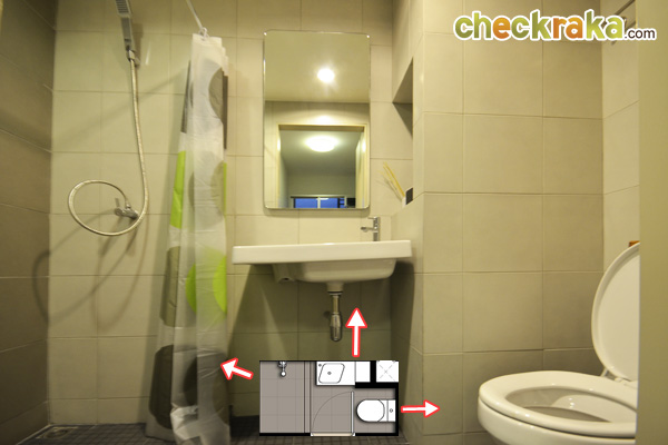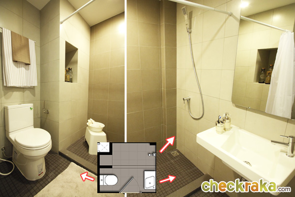 สำหรับในห้องน้ำ เทียบจาก Layout จะเห็นว่า แบ่งส่วนแห้งและส่วนเปียกคนละครึ่งด้วยธรณียกสูง