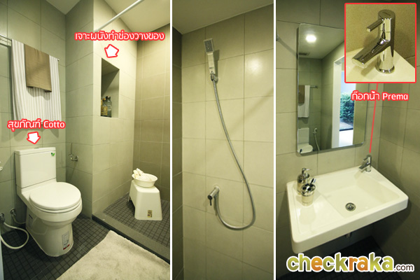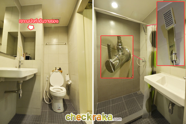 และในส่วนเปียกมีการเจาะผนังทำช่องสำหรับวางอุปกรณ์ในห้องน้ำแทนชั้นวางของ