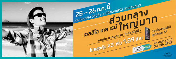 ในวันที่ 25-26 ต.ค. 57 ที่จะถึงนี้ ทางโครงการเอลิโอ เดล เรย์ เตรียมจัดโปรโมชั่นสุดคุ้ม "X5" มอบส่วนลด ณ วันโอนฯ สูงสุด 200,000 บาท และเฟอร์นิเจอร์แต่งครบ พิเศษกว่า ฟรี!! ค่าสวนกลาง 1 ปี ค่ากองทุนแรกเข้า และค่าธรรมเนียมการโอน พร้อมข้อเสนอผ่อนชำระเงินจอง และทำสัญญา 30,000 บาท ดอกเบี้ย 0% นาน 10 เดือน (ตามเงื่อนไขที่บริษัทกำหนด) ในราคาเริ่มต้นเพียง 1.59 ล้านบาท และจองในงานรับ iPhone 6 ฟรี! ชมห้องจริง วิวจริงก่อนใคร พร้อมชมมินิคอนเสิร์ตจาก ว่าน ธนกฤต และร่วมสนุกกับกิจกรรมต่างๆ มากมาย ณ โครงการ เอลลิโอ เดล เรย์ สุขุมวิท 64