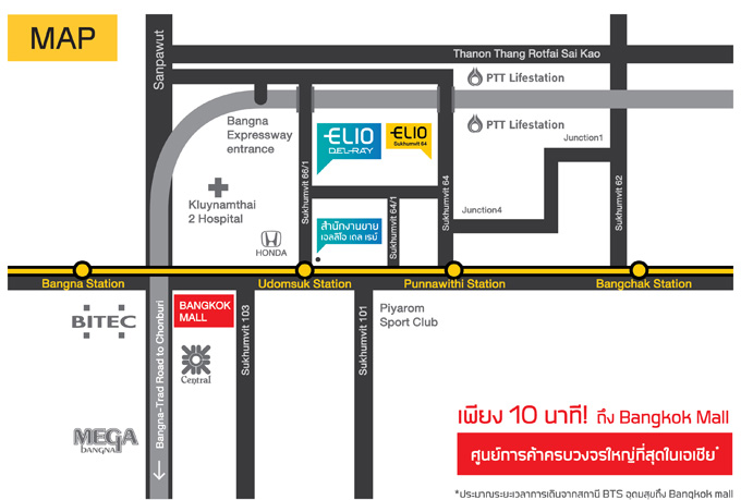 สำหรับการเดินทางด้วยรถไฟฟ้า BTS สามารถใช้ได้ 2 สถานีด้วยกัน คือ สถานีอุดมสุขเพียง 600 เมตร จากโครงการ และสถานีปุณณวิถี 650 เมตร จากโครงการ ถือว่าสะดวกมากๆ เราลองไปดูตัวอย่างการเดินทางจากสถานีอุดมสุขเข้าไปยังโครงการ Elio Del Ray กันค่ะ