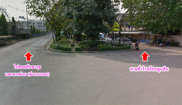 และเยื้องกับร้านค้าแผงลอยจะเป็นโรงเรียนพูนสินอยู่ทางขวามือ