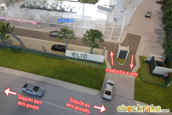 - ทำเลที่ตั้ง - โครงการนี้ตั้งอยู่ภายในซอยระหว่างซอยสุขุมวิท 64 ทะลุซอยสุขุมวิท 66/1 และอยู่ใกล้รถไฟฟ้า BTS ถึง 2 สถานีด้วยกัน คือสถานีอุดมสุข และสถานีปุณณวิถี โดยทั้ง 2 สถานีห่างจากโครงการไม่ถึง 1 กม. เท่านั้น (สถานีอุดมสุข 600 เมตรและสถานีปุณณวิถี 650 เมตร) ด้านหลังของโครงการติดกับทางด่วนก็อาจจะมีเสียงดังบ้างเล็กน้อยสำหรับห้องที่อยู่ติดกับฝั่งทางด่วน (แต่เราเข้าใจว่าทางโครงการก็ได้รับทราบถึงปัญหานี้ และอาจมีการติดอุปกรณ์กันเสียงให้กับยูนิตทางด้านนี้) ส่วนด้านหน้าโครงการจะเป็นชุมชนชาวบ้าน ร้านค้าเล็กๆ และร้านค้าแผงลอย ส่วนแหล่งอาหารการกินที่ใกล้ที่สุดสำหรับโครงการนี้ก็น่าจะเป็นปั๊มน้ำมัน ปตท. ใหญ่ใกล้ๆ ที่เปิดตลอด 24 ชั่วโมง (แต่ก็คงไม่ใช่ทุกร้าน) ซึ่งอยู่ห่างจากโครงการเพียง 200 เมตรเท่านั้น หรือไม่ก็ต้องนั่งรถมอเตอร์ไซค์ออกไปที่ปากซอยสุขุมวิท 64 บริเวณนั้นก็จะมีร้าน 7-Eleven และร้านค้าริมทางให้เลือกทานเยอะพอสมควรเลยทีเดียว แต่ถ้าอยากจะช้อปปิ้งห้างใหญ่ๆ หรือซื้อของกินของใช้แบบเป็นเรื่องเป็นราวก็มีอยู่ไม่ไกลจากโครงการมากนัก เช่น เทสโก้โลตัสอ่อนนุช ระยะห่างจากโครงการประมาณ 3 กม. หรือ เซ็นทรัลบางนา ระยะห่างจากโครงการประมาณ 4.4 กม.