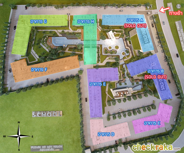 - อาคาร E สูง 8 ชั้น ห้องพักอาศัย 258 ยูนิต