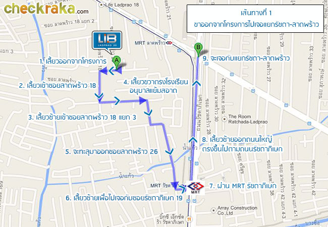 ออกจากโครงการมาอย่างที่บอกจะเจอกับร้านส้มตำตรงหน้าประตูโครงการเลยค่ะ เห็นแล้วอุ่นใจไม่อดตายแน่นอน ติดกับร้านส้มตำ อยู่เยื้องๆ โครงการเป็น อพาร์ตเมนต์ สูง 5 ชั้น ภายในซอยนี้เป็นถนนสองเลนแค่พอรถสวนกันเท่านั้นค่ะ หลบ เบียดกันได้ ตามปกติ ที่เห็นก็จะมีร้านทำผม ร้านซักผ้า ร้านกาแฟ บรรยากาศโดยรวมจะเป็นบ้านคน หรือหอพัก อพาร์ตเมนต์ มากกว่า ถ้าไม่ชอบความอึกทึกซอยนี้ก็ตอบโจทย์เลยค่ะ เดินมาเรื่อยๆ ถึงปากซอยแล้วค่ะ ใช้เวลาประมาณ 10 นาทีเหนื่อยนิดหน่อย จากนั้นเลี้ยวขวานะคะ วิวถนนมุ่งหน้าห้าแยกลาดพร้าว สภาพการจราจร (ช่วงเวลาประมาณ 14.00-15.00 น.) ลื่นไหลดีทีเดียวค่ะ หน้าปากซอยมีป้ายของโครงการใหญ่สะดุดตาให้เห็นชัดเจน เดินมาไม่ไกลมาก เลาะตามฟุตบาทก่อนถึง MRT จะเจอกับเต้นท์รถมือสอง ถึง MRT ลาดพร้าวแล้วค่ะ เส้นทางที่ 1 - ขาออกโครงการ เข้าซอยลาดพร้าว 18 วนออกไปเจอแยกรัชดา-ลาดพร้าว