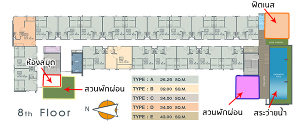 จะเป็นยูนิตพักอาศัยทั้งหมดค่ะ หนึ่ง ชั้นจะมีทั้งหมด 26 ห้อง ลักษณะอาคารจะเป็นหน้ากว้าง ยูนิตส่วนใหญ่จะมีระเบียงหันไปทางทิศตะวันออกและทิศตะวันตกค่ะ ชั้นที่ 8 จะเป็นยูนิตที่พักอาศัยและส่วนกลางค่ะ