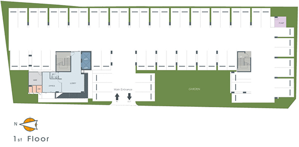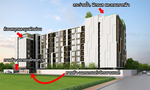 ตัวอาคารจะหันหน้ามาทางทิศตะวันตกและ ส่วนกลางจะอยู่ที่ชั้น 8 ทั้งหมดค่ะ จะมีห้องสมุด และมุมพักผ่อนเล็กๆ และมีพื้นที่สีเขียวเป็นสวนดาดฟ้าให้ได้นั่งชมวิว รวมถึงฟิตเนส และสระว่ายน้ำแบบ infinity edge