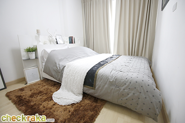 รูปแบบห้องและวัสดุ - การจัดวางพื้นที่การใช้งานต่างๆ ของห้องแบบ 1 ห้องนอน ขนาด 26.25 ตร.ม. นั้นถือว่ายังไม่ลงตัวในส่วนของห้องน้ำและ Pantry ค่ะ เรามาดูที่ห้องน้ำกันก่อน ห้องน้ำที่ให้มานั้นค่อนข้างเล็กทีเดียวค่ะ การจัดวางสุขภัณฑ์ต่างๆ ทำให้ห้องน้ำดูแคบเข้าไปอีก เมื่อเปิดประตูห้องน้ำเข้าไปประตูก็ชนกับโถสุขภัณฑ์ โซนเปียกสำหรับอาบน้ำฝักบัวที่ทำให้ไว้ก็แคบเหมือนกัน เมื่อเป็นเช่นนี้ถ้าเราไม่หาม่านมาบังก็จะเปียกไปทั่วห้องน้ำเลยล่ะค่ะ มาถึงส่วน Pantry บ้างตรงนี้โครงการจัด built in มาให้ และจะมีประตูกระจกบานเลื่อนกั้นไว้ระหว่างห้องนั่งเล่นและระเบียงค่ะ เผื่อว่าเวลาทำอาหารจะส่งกลิ่นรบกวน แต่ว่าพื้นที่ตรง Pantry นี้เล็กไปสักนิดจะทำอาหารจริงจังอาจจะลำบากหน่อยค่ะ ในความเป็นจริงคงทำได้แค่อุ่นอาหารจากไมโครเวฟ ดังนั้นถ้าเอาประตูกั้นส่วนนี้ออกไปก็จะเพิ่มพื้นที่ห้องนั่งเล่น จะทำให้ดูกว้างมากขึ้นค่ะ ตัวอย่างวัสดุที่ใช้ในโครงการ เช่น สุขภัณฑ์ Cotto, ประตูบานสำเร็จรูป High Density Fiberboard (HDF) หรือเทียบเท่า, กรอบประตูบานเลื่อนและหน้าต่างวัสดุเป็นอลูมิเนียมสีดำ และกระจกติดภายนอกเป็นกระจกสีเขียวตัดแสงส่วนภายในเป็นกระจกใสธรรมดาค่ะ