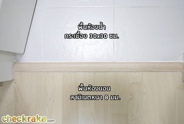 พื้นห้องนอนเป็นพื้นลามิเนต และห้องน้ำเป็นกระเบื้อง 30x30 ซม.ไม่มีธรณีกั้นให้ ตรงนี้ถ้าโดนน้ำมากๆ เข้าอาจจะบวมได้ค่ะ
