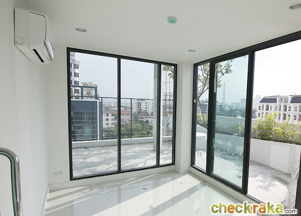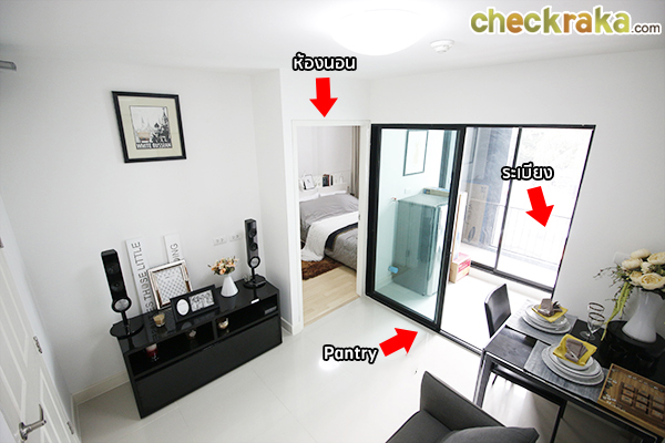 ห้องนี้จะถูกจัดวางโดยให้ส่วนนั่งเล่นอยู่หน้าสุดค่ะ ถัดไปก็จะเป็น Pantry ที่เชื่อมออกไปยังระเบียง