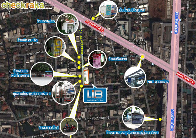 แผนที่แสดงบริเวณรอบๆ โครงการ ภายในซอยลาดพร้าว 20 เป็นซอยขนาดเล็กมีอพาร์ตเมนต์ และคอนโดค่อนข้างมาก มีร้านอาหาร ร้านกาแฟ ร้านซักอบรีด และร้านส้มตำติดกับกำแพงของชุมสายโทรศัพท์ลาดพร้าว 1 และอยู่หน้าโครงการเลย แต่ความพลุกพล่านยังน้อยกว่าเมื่อเปรียบเทียบกับซอยลาดพร้ว 18 ถ้าจะเดินออกไปเพื่อหาซื้ออาหาร ผัก ผลไม้ ของใช้ต่างๆ ในซอย 18 อาจจะเหนื่อยเกินไป แนะนำให้โบกเรียกพี่วินดีกว่าค่ะ ออกจากประตูโครงการไป ก็เจอพี่วินอยู่หัวมุมถนนคอยบริการ เราลองเดินจากโครงการไปรถไฟฟ้า MRT สถานีลาดพร้าวกันดีกว่าค่ะ