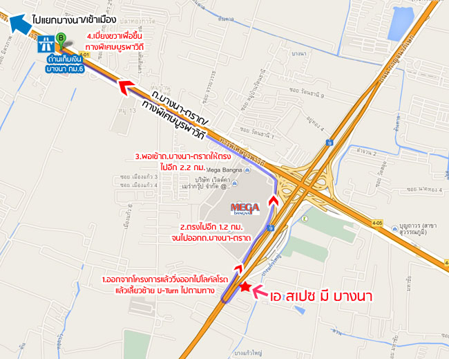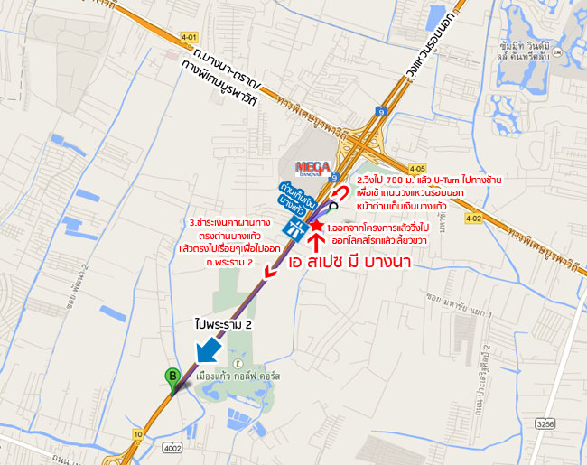 ออกมาจากทางออกโครงการ ทางด้าน โลคัลโรดเลียบวงแหวนฯ ให้เลี้ยวซ้ายค่ะ ออกมาแล้วก็ตรงไปเรื่อยๆ ประมาณ 200 ม. ค่ะ จะถึงจุด U-Turn ใต้สะพานก็ให้วนขวาไปตามทางเลยค่ะ จากจุด U-Turn ใต้สะพานตรงมาประมาณ 350 ม. ก็จะถึงทางเข้า Mega บางนา ทางด้านโลคัลโรด วงแหวนฯ ค่ะ จากมุมนี้ของ Mega บางนา เห็นตัวโครงการชัดเจนเลยค่ะ 2. เดินทางด้วยรถสาธารณะ และรถไฟฟ้า