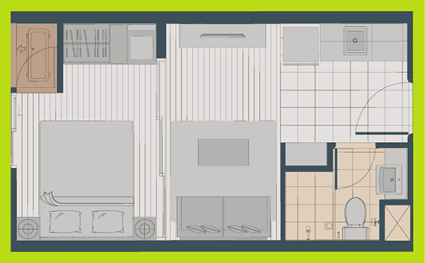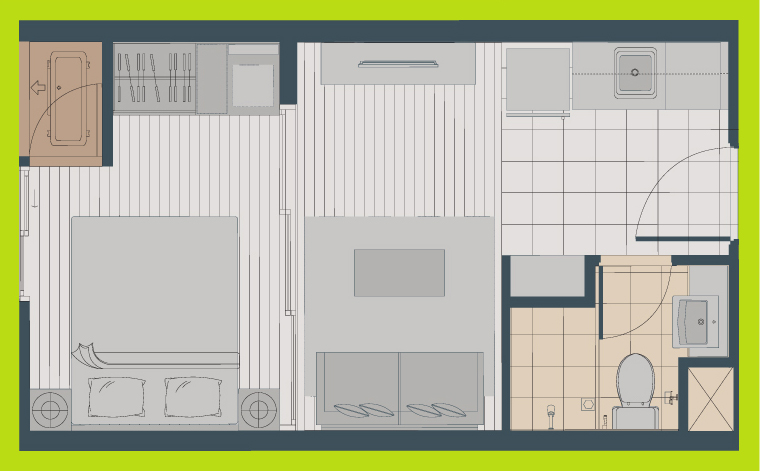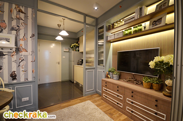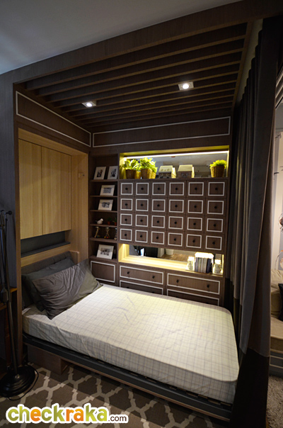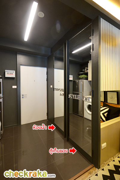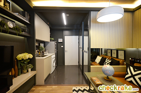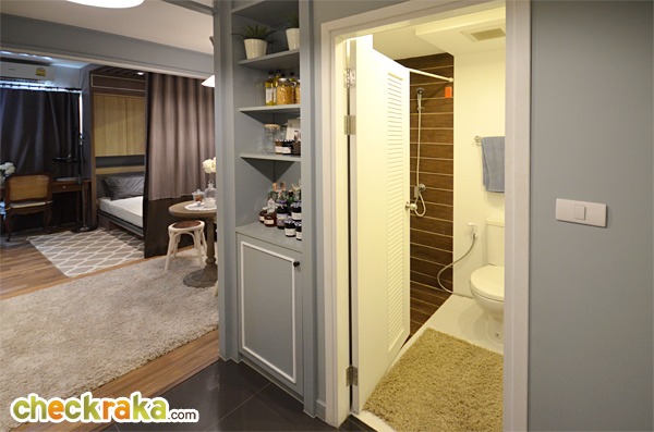 ห้องนี้ ครัวจะอยู่ทางด้านซ้ายมือค่ะ ทางด้านขวาจะเป็นห้องน้ำ สุขภัณฑ์ภายในห้องน้ำได้เหมือนกับห้องที่แล้วทุกอย่าง พื้นที่เว้าหน้าห้องน้ำ Built-in ทำเป็นชั้นวางของ และตู้เก็บของด้านล่าง มุมนี้มองจากโซนห้องนั่งเล่นย้อนกลับไปทางด้านหน้าประตูค่ะ ระหว่างห้องครัวกับห้องนั่งเล่นแบ่งพื้นที่ให้ดูเป็นสัดส่วนมากขึ้นด้วยฉากกั้น Built-in ทำเป็นเหมือนซุ้มประตู ห้องนี้เอาประตูบานสไลด์ระหว่างห้องนั่งเล่นและห้องนอนออก และติดเป็นม่านบังสายตาแทน ซึ่งข้อดีคือเวลาที่รูดม่านพับเก็บชิดกับผนังจะช่วยทำให้พื้นที่โซนนี้เชื่อมต่อกันดูกว้างขวางมากยิ่งขึ้น เตียงนอนขนาด 3.5 ฟุต แบบพับเก็บได้ และสามารถปรับเปลี่ยนพื้นที่จุดนี้ให้เป็นพื้นที่สำหรับทำงานแทนก็ยังได้ ส่วนตู้เสื้อผ้าจะอยู่ฝั่งตรงข้ามกับเตียงนอนเช่นเคย