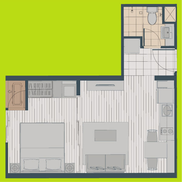 โดยส่วนแรกตรงประตูทางเข้าคือพื้นที่ส่วนห้องน้ำและครัว ส่วนที่สองเป็นพื้นที่รับแขก