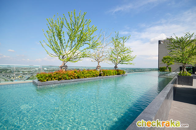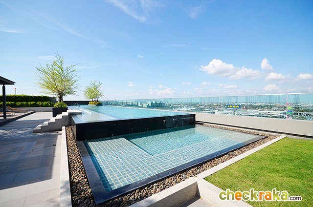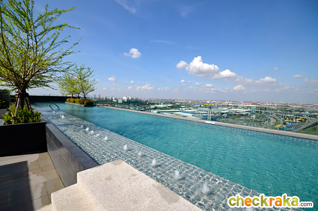 เดินออกมาจากประตูอาคารจะเห็นสระว่ายน้ำแบบ Infinity Edge Pool พร้อม Pool Deck ค่ะ
