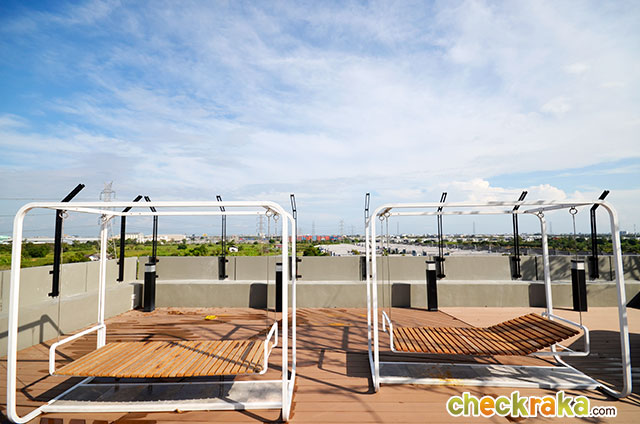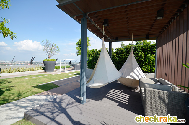 ด้านหลังฟิตเนสทางโครงการจัดเป็นสวน พร้อมพื้นที่นั่งเล่น มีศาลานั่งเล่น และชิงช้าผ้าแบบแขวน 2 ตัว