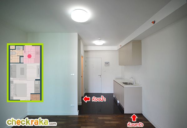 corridor) มีขนาดกว้าง 1.5 เมตรค่ะ เปิดประตูห้องเข้ามาเจอกับพื้นที่ส่วนของห้องน้ำ (ทางซ้าย) และส่วนครัว (ทางขวา) ถัดไปเป็นห้องนั่งเล่น ส่วนความสูงห้องถึงเพดานอยู่ที่ 2.60 เมตร เหมือนกัน เคาน์เตอร์ครัวเปิดออกมาหน้าตาประมาณนี้ค่ะ ด้านบนเป็นตู้เก็บของเป็นแบบบานเปิดธรรมดาไม่ใช่ Soft Close
