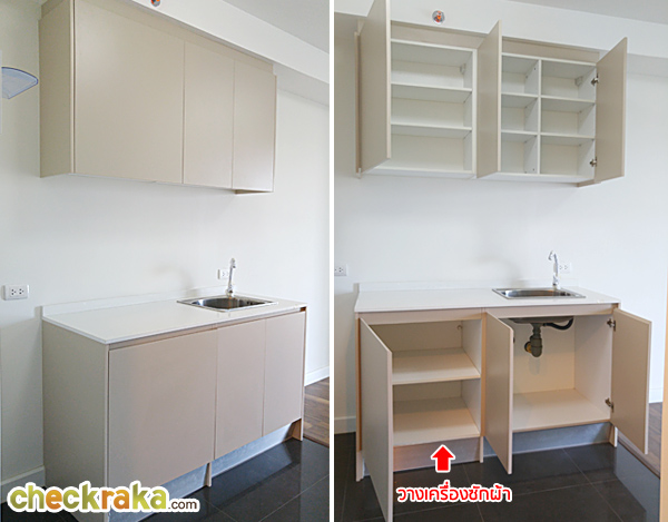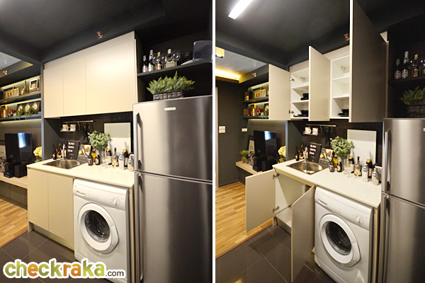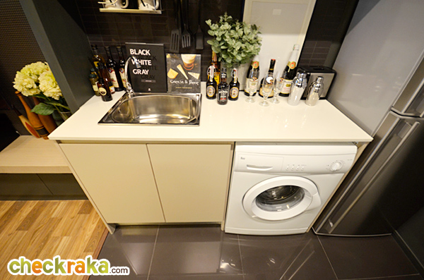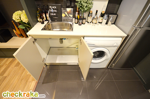 ส่วนเครื่องซักผ้าจะวางไว้ใต้เคาน์เตอร์ครัว โดยการปรับเปลี่ยนเอาชั้นวางของใต้เคาน์เตอร์ครัวออก แล้ววางเป็นเครื่องซักผ้าแทน (วางได้เฉพาะฝาหน้าเท่านั้น) ทางโครงการเดินท่อไว้ให้เรียบร้อยแล้ว
