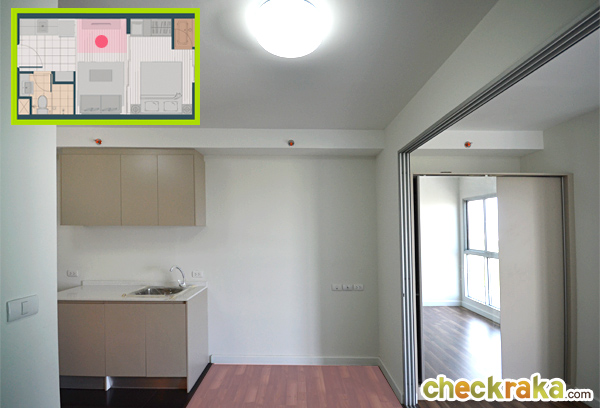 ฝั่งตรงข้ามของห้องน้ำเป็นโซนห้องครัว แบบครัวเปิด ได้ไฟติดเพดานเป็นโคมซาลาเปา 1 ดวง