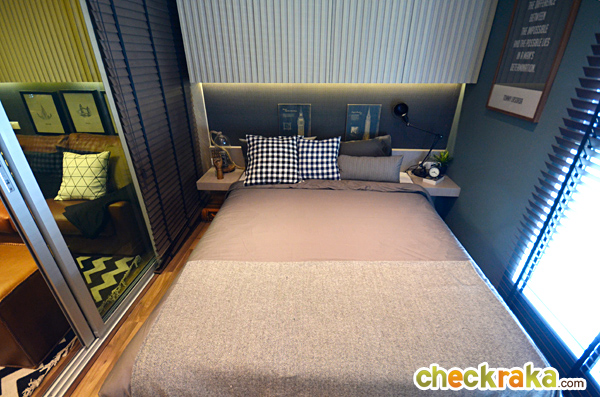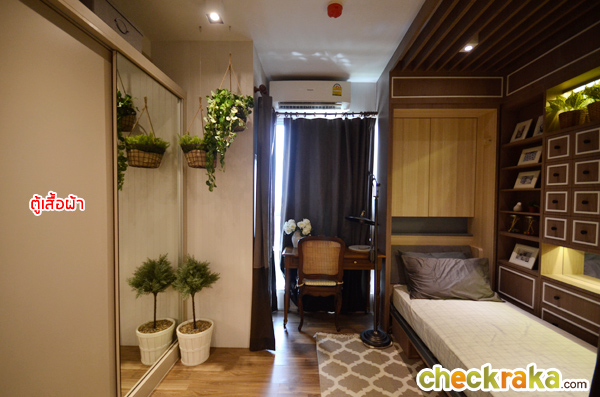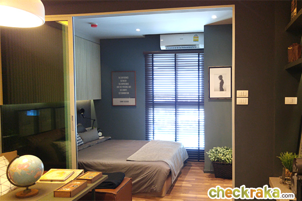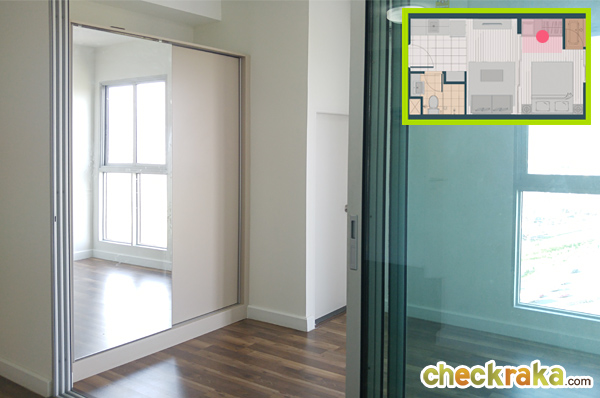 สำหรับวางโซฟาแบบ 2 ที่นั่ง ช่วย ทำให้ระยะดูทีวีกว้างมากขึ้น และโต๊ะกลางเก๋ๆ ขนาดไม่ใหญ่มากมาตั้งได้อีก 1 ตัว ระยะห่างโซฟากับทีวีติดผนังเหลือพื้นที่ห่างเยอะค่ะ ยังจัดทีวีขนาดใหญ่กว่านี้ได้ ส่วนช่วงทางเดินก็ถือว่ากว้างขวางดีถึงแม้จะวางโต๊ะกลางแล้วก็ตาม โซนพื้นที่รับแขกช่วงกลางห้องขนาดกำลังดี พอดันประตูบานเลื่อนให้เปิดหมดห้องก็ดูโล่งดี แบบนี้เวลาเปิดหน้าต่างก็น่าจะรับลมได้อยู่ค่ะ ลองดันบานเลื่อนเปิดหมดให้ดูค่ะ พื้นที่ส่วนนี้ถือว่าแบ่งสัดส่วนได้ลงตัวทีเดียวค่ะสำหรับห้องขนาด 25 ตร.ม. มาดูภายในห้องนอนกันบ้างค่ะ ขนาดห้องจัดเตียงใหญ่สุดได้ที่ขนาด 5 ฟุต สองฝั่งเตียงยังเหลือพื้นที่ข้างเตียงให้เดินได้อยู่ค่ะ ถ่ายย้อนจากหัวนอนอีกด้านให้เห็นประตูระเบียง และจุดที่วางตู้เสื้อผ้าบิวท์อินค่ะ ตำแหน่งของตู้เสื้อผ้าตามนี้เลยนะคะ ตู้เสื้อผ้าแบบ Built-in ที่ทางโครงการให้มา เปิดตู้มาหน้าตาแบบนี้ค่ะ