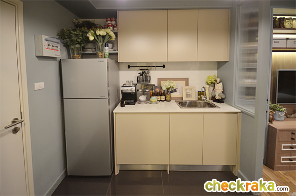 วัสดุหน้าท็อปและบานตู้เป็น Particle Board เคลือบเมลามีน มีอ่างล้างจาน และพื้นที่สำหรับเตรียมอาหาร ลิ้นชักใต้เคาน์เตอร์ครัวสามารถถอดออก และทำเป็นที่วางเครื่องซักผ้าได้ตามแบบในภาพ ใต้อ่างล้างจานเป็นตู้บานเปิดสามารถเก็บของได้อีกด้วยค่ะ อ่างล้างจานอลูมิเนียม 1 หลุม แบบฝังเคาน์เตอร์ ฝั่งตรงข้ามกับครัว เป็นห้องน้ำ ซึ่งทางโครงการดีไซน์ประตูห้องน้ำมาเป็นกระจกเงา ทำให้ห้องดูกว้างขึ้น เปิดประตูมาถึงจะเห็นห้องน้ำด้านใน ส่วนด้านข้างประตู Built-in ทำเป็นชั้นเก็บของ สำหรับเก็บกระเป๋า หรือรองเท้าก็ยังได้