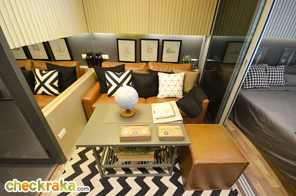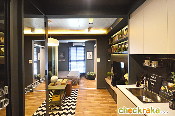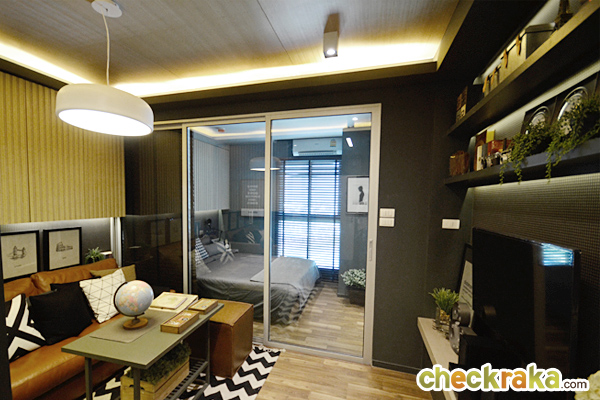 2) ห้องแบบ 1 ห้องนอน ขนาด 25 ตร.ม. ที่ตกแต่งออกมาในสไตล์เข้มๆ ขรึมๆ โทนสีน้ำตาล เทา ดำ