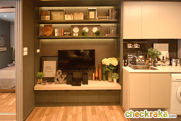 ติดกับเคาน์เตอร์ครัวเป็นตำแหน่งสำหรับชั้นวางทีวี ตรงจุดนี้ติดตั้งปลั๊ก และสวิตช์มาให้พร้อมใช้งาน