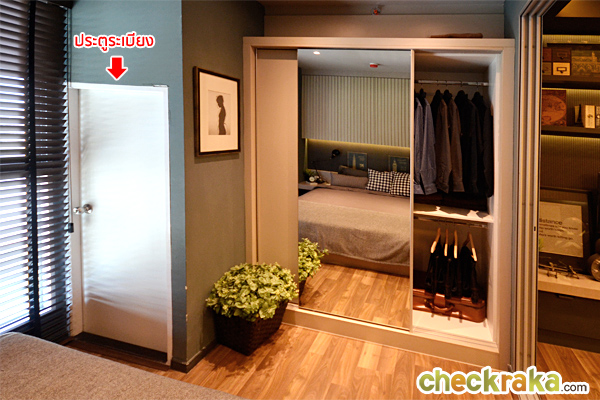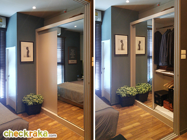 ทางซ้ายของห้องได้ตู้เสื้อผ้าแบบบานสไลด์ ด้านหนึ่งเป็นกระจกเงา อีกด้านเป็นแบบทึบ