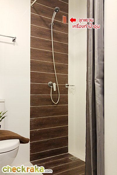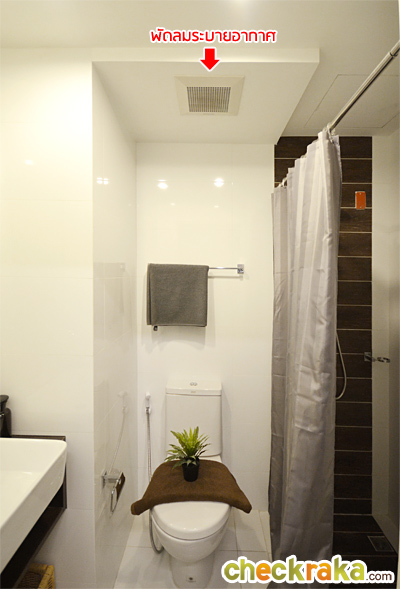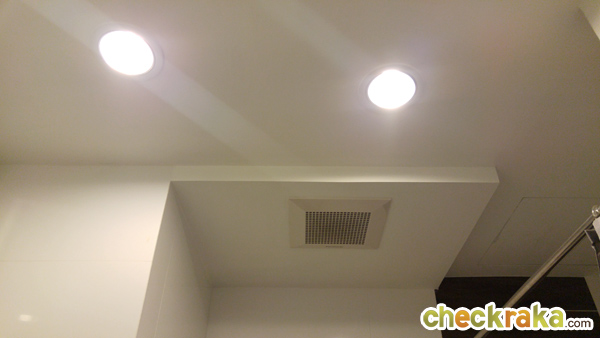 ของภายในห้องให้ตามนี้เลยค่ะ ติดพัดลมระบายอากาศมาให้ 1 ตัว บนเพดานมีไฟดาวน์ไลท์แบบกลมให้ 2 ดวง ฝักบัว และก๊อกน้ำ ของ American Standard ไม่มีเครื่องทำน้ำอุ่นให้ แต่ติดตั้งจุดสำหรับแขวนเครื่องทำน้ำอุ่นมาให้
