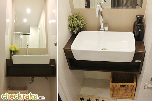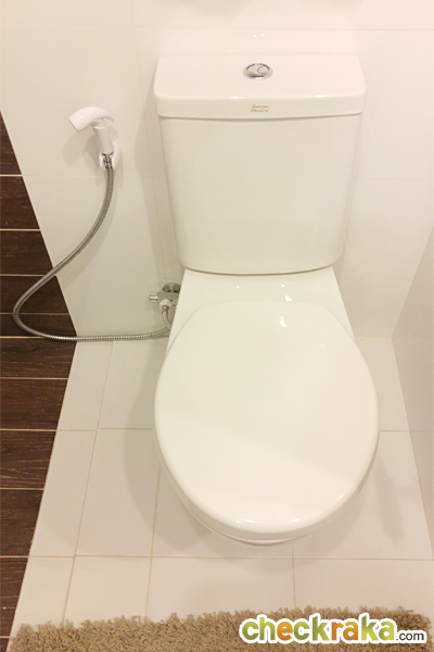 โซนอาบน้ำไม่มีฉากกั้นอาบน้ำให้นะคะ แนะนำให้ติดฉากกั้นอาบน้ำ หรือหาม่านมาบังเพื่อช่วยป้องกันน้ำกระเด็นออกมาโซนด้านนอก ส่วนพื้นและผนังปูกระเบื้องลายไม้สีเข้มตัดกับสีขาว โถสุขภัณฑ์เป็นของ American Standard อ่างล้างหน้าเแบบวางบนเคาน์เตอร์สีขาวของ Marvel มีพื้นที่เก็บของด้านล่างนิดหน่อยสำหรับเก็บอุปกรณ์ในห้องน้ำ