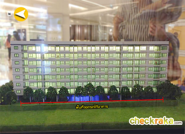 โมเดลโครงการมุมมองจากทางฝั่งทิศเหนือ ติดกับอาคารพาณิชย์ สูงประมาณ 4-5 ชั้น