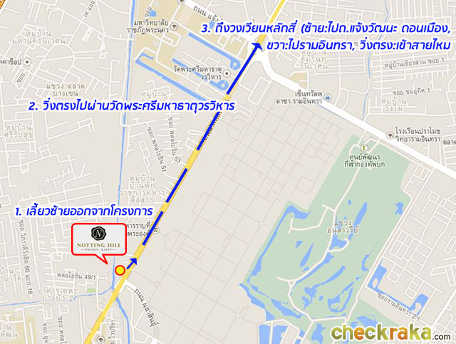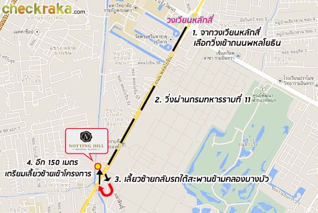 แต่ถ้ามาจากวงเวียนหลักสี่ (ฝั่งตรงข้ามโครงการ) ให้เบี่ยงซ้ายเข้าถนนผลาสินธุ์ก่อนที่จะลอดใต้สะพานข้าม
