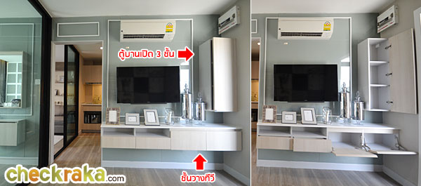 เข้ามาในห้องทางขวามือจะเป็นมุมของชั้นวางทีวี แบบบานเปิด และชั้นวางของเล็กๆ (ได้ทั้งหมดยกเว้นทีวี)