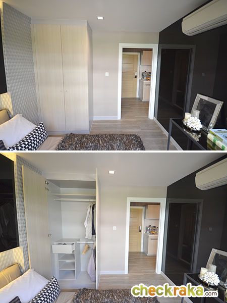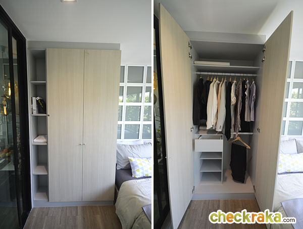 ตู้เสื้อผ้า Built-in ที่โครงการให้มา จากภาพจะอยู่ทางด้านซ้ายของเตียง