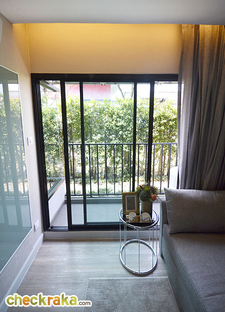 ส่วนประตูระเบียงเป็นประตูกระจกบานเลื่อนแบบ 2 บาน กรอบอลูมิเนียมสีดำ