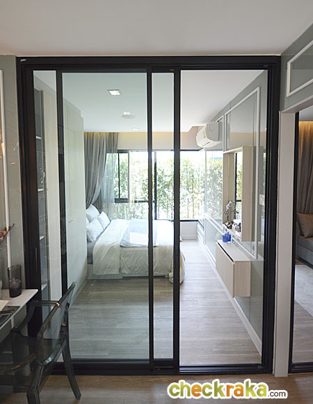 ห้องนอนกั้นด้วยประตูกระจกบานเลื่อนแบบ 2 บาน สามารถปรับเลื่อนเพิ่มความรู้สึกโปร่งโล่งให้กับห้องนอนได้